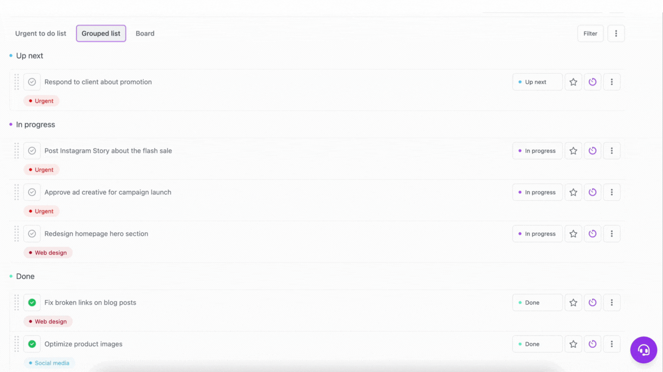 Grouped list by status: Tasks organised by their current status, giving you a clear overview of progress and priorities at a glance.