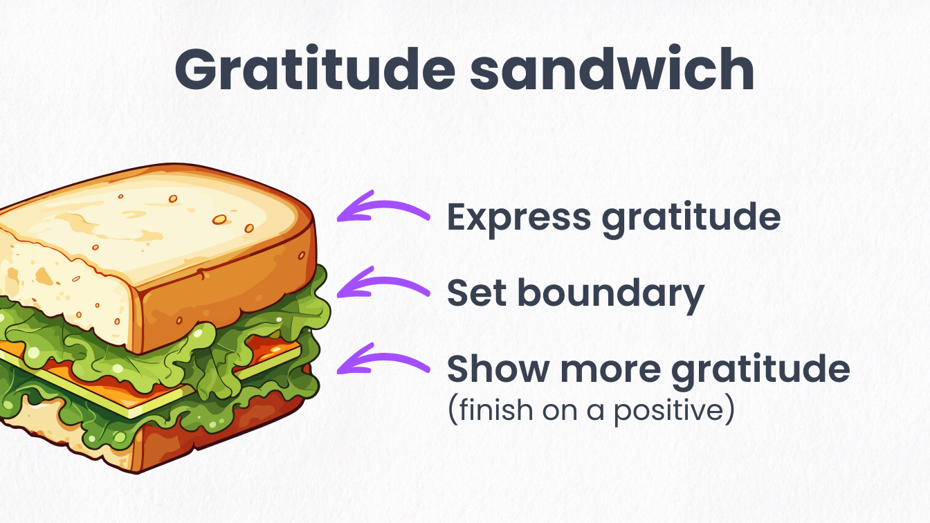 One of the most effective and respectful ways to say no is by using the “gratitude sandwich.” This technique allows you to decline requests in a way that is polite and positive, helping to preserve relationships while maintaining your boundaries. The concept is simple: you begin by expressing appreciation, then clearly state that you can't commit, and close with a positive or supportive note.