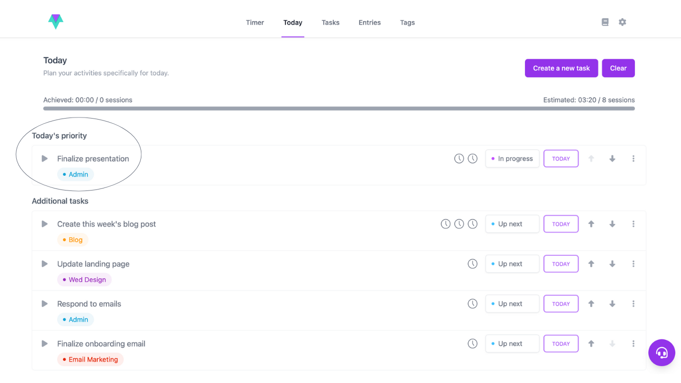 To further streamline your workflow, you can arrange tasks in order of priority. This ensures that you tackle the most urgent tasks first, leaving less critical tasks for later. By assigning estimated Pomodoros to each task, you gain insight into how much effort your day's work will require. Totalling these estimates gives you a realistic picture of whether your plan fits into your day, helping you adjust your expectations and avoid overcommitting.
