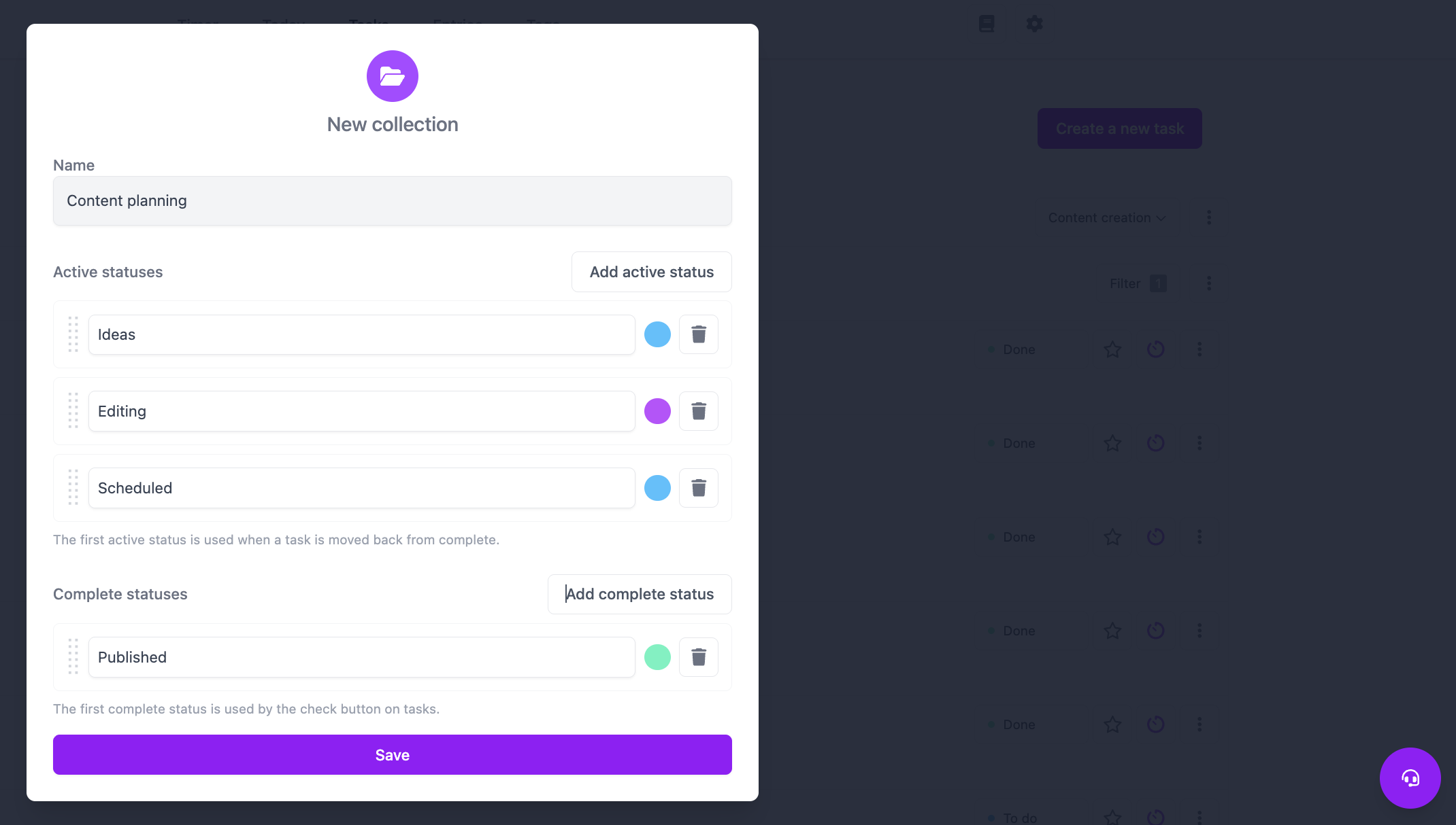 Define unique status sets for each collection so you always know where each task stands.